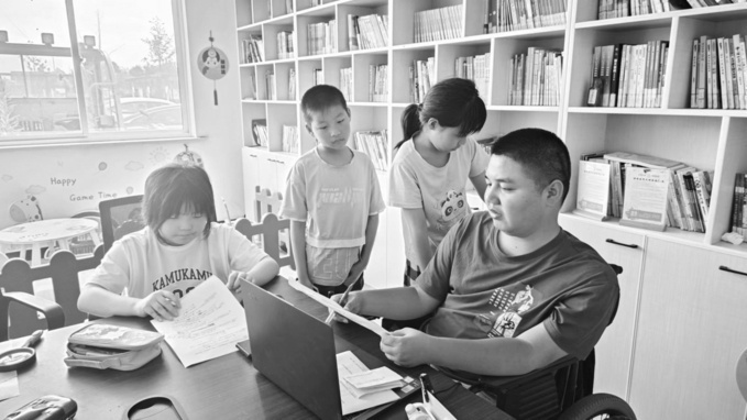 今年的“爱心暑托班”有两个班级,分别在社区党群服务中心一楼的农家书屋和二楼的会议室。由于夏唯壹无法上楼,他只能在农家书屋为即将读四年级的孩子们辅导作业。