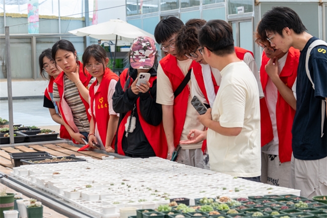 7月1日,实践团师生一行10余人抵达郭猛镇。在镇政府支持下,团队走访了国胜家庭农场、鹏顺家庭农场及盐城七秒农业科技有限公司。在鹏顺农场,成员们近距离观察了大型水肥无人机、巡田小型无人机的作业场景,并详细记录粮食烘干设备的智能化运行细节。国胜农场的水肥一体化灌溉系统演示,让学子们直观感受到科技提升农业效能的巨大潜力,同时也了解到农场面临的高投入成本、劳动力老龄化等现实挑战。在七秒农业科技公司,团队深入调研了物联网技术在土壤墒情监测、大棚环境智能调控等场景的应用,并就系统优化方向与企业技术人员展开探讨,挖掘校企合作空间。下午,部分成员重返七秒公司,深入学习自动化设备操作及多肉植物养护技巧。三名成员更化身“带货主播”,亲身体验“产供销”一体化运营模式。公司负责人周浩分享的“因兴趣返乡创业”成功经历,生动展现了青年人才正成为驱动乡村产业发展的“新农人”力量,更坚定了学子们科技助农的初心。