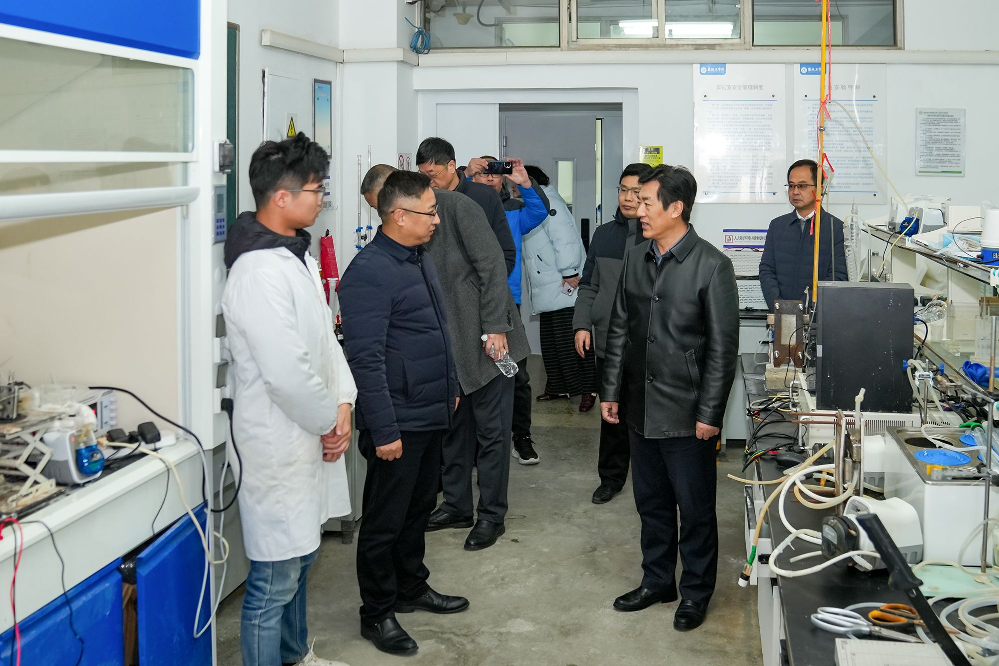 检查组一行深入化工学院实验室、北校区第一学生食堂、4#学生宿舍、纺服学院实验室、南校区二期一楼学生食堂、留学生公寓、25-26#学生宿舍、土木学院实验室、汽车学院实验室等重点场所,实地检查安全管理落实情况。