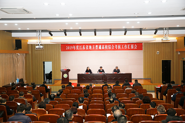 1月3日上午,根据江苏省2019年度高校年终综合考核组工作安排,学校在机械馆报告厅召开年终综合考核工作汇报会。省考核委第九综合考核组组长、苏州大学原党委书记王卓君到会指导,综合考核组全体成员,校党委书记刘祖汉,校长、党委副书记方海林等校领导班子成员,两委委员、省政协委员、民主党派负责人、教授代表以及中层正职,职能部门、直属单位和科研机构副职干部参加。刘祖汉主持会议。