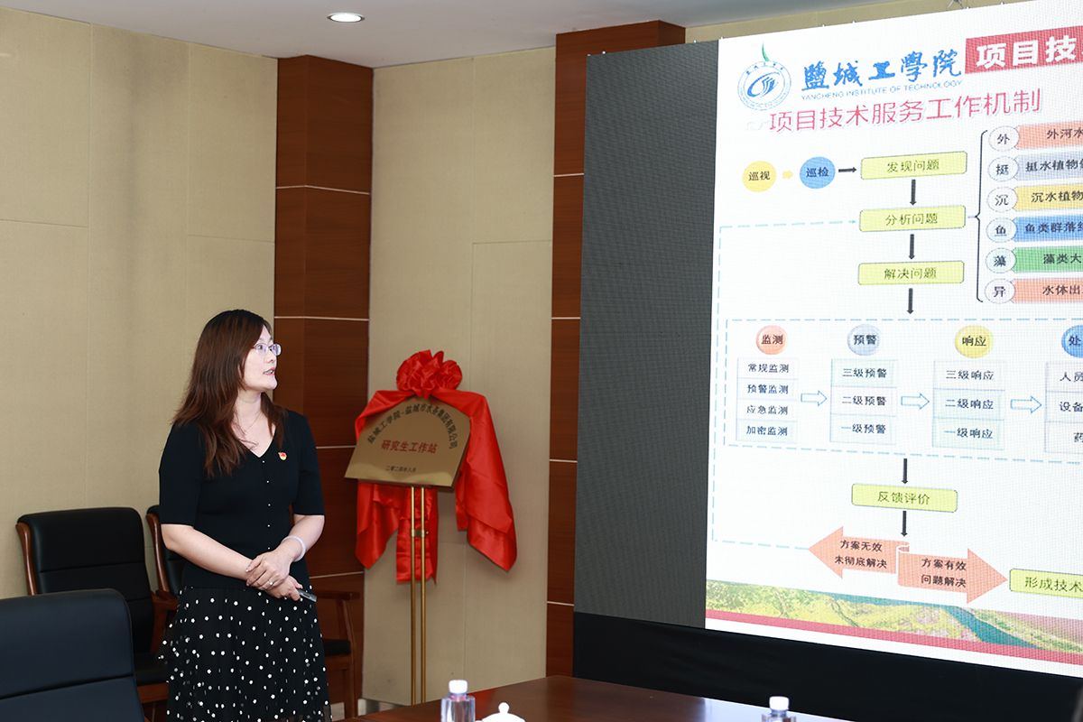 丁成和卞桃华共同为研究生工作站揭牌。校党委常委、党委组织部部长邢晓平和卞桃华签订党建共建协议书。研究生工作部部长、研究生院院长许伟为研究生企业导师颁发聘书。环境学院院长陈天明与卞桃华签订产学研合作协议书。环境学院副院长李璇作盐龙湖技术服务季度工作汇报。