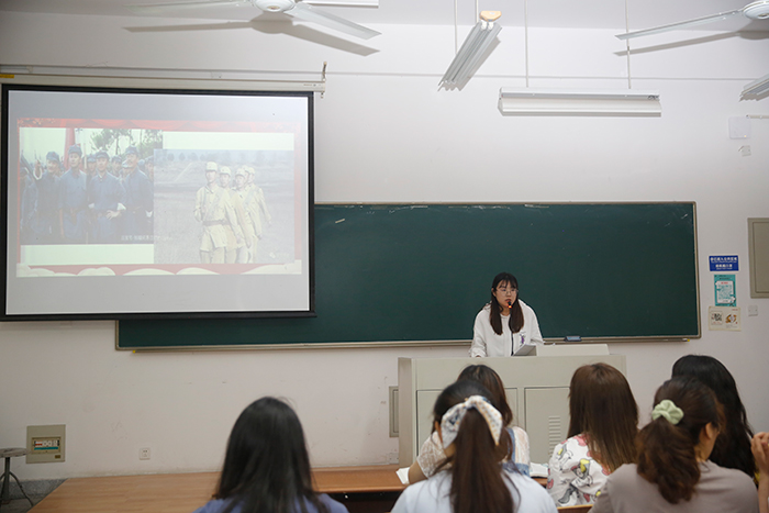 “军服是军人的外在标志,是国威、军威的象征。我们在看军装的时候,不能仅关注它的款式和颜色,更应该认识到它所代表的信仰和更深层次的意义。”5月10日晚,在南校区润美楼B301教室不时传来一阵阵掌声,原来是设计艺术学院B服装191、192班正在上一堂特殊的思政课。在这堂《毛泽东思想与中国特色社会主义理论体系概论》课中,学生不再是讲台下被动的听众,而是走上讲台的汇报者,是翔实资料背后的搜集者。