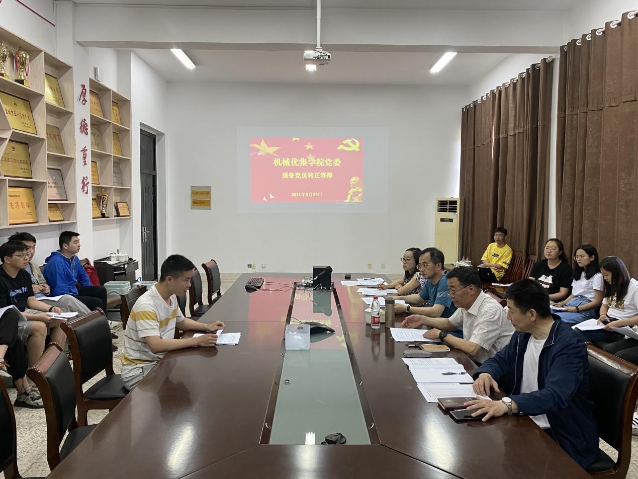 5月29日下午,机械优集学院党委在南校区机械馆会议室举办预备党员转正答辩教育活动,在校的35名2021年春学期拟转正预备党员通过汇报预备期间表现、随机抽题和评委提问等方式进行答辩。校关工委副主任、原党委宣传部部长马汝伟出席,机械优集学院党委书记孙雷、副书记秦卫兵、学生支部书记等担任评委。