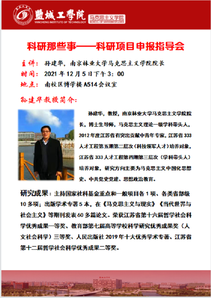 12月5日下午,在南校区博学楼A514会议室,南京林业大学孙建华教授应邀来澳客彩票网_中国足球彩票-app官方下载作科研项目申报指导会。澳客彩票网_中国足球彩票-app官方下载:主席谢毅敏、马克思主义学院副院长赵迎华、马克思主义学院2021年新进教师和校内转岗教师以及申报2022年国家社科基金的全体教师参加交流。马克思主义学院党总支书记、常务副院长钱长锋主持会议。
