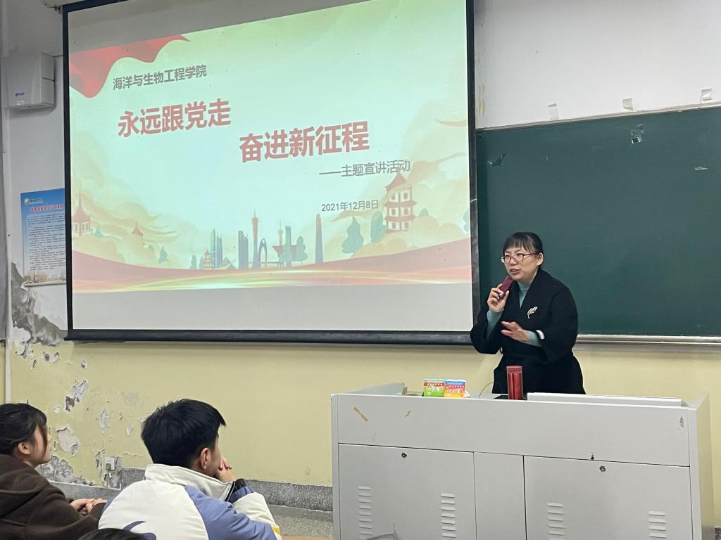 12月8日下午,在北校区知行楼103教室,海生学院邀请马克思主义学院副教授侯慧艳老师作题为《永远跟党走,奋进新征程》的主题宣讲会,团委副书记王珂主持,学生会干部和“青马工程”学员聆听了讲座。