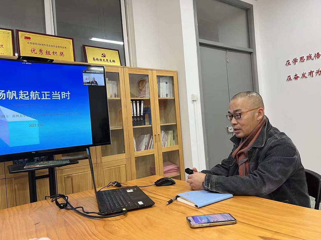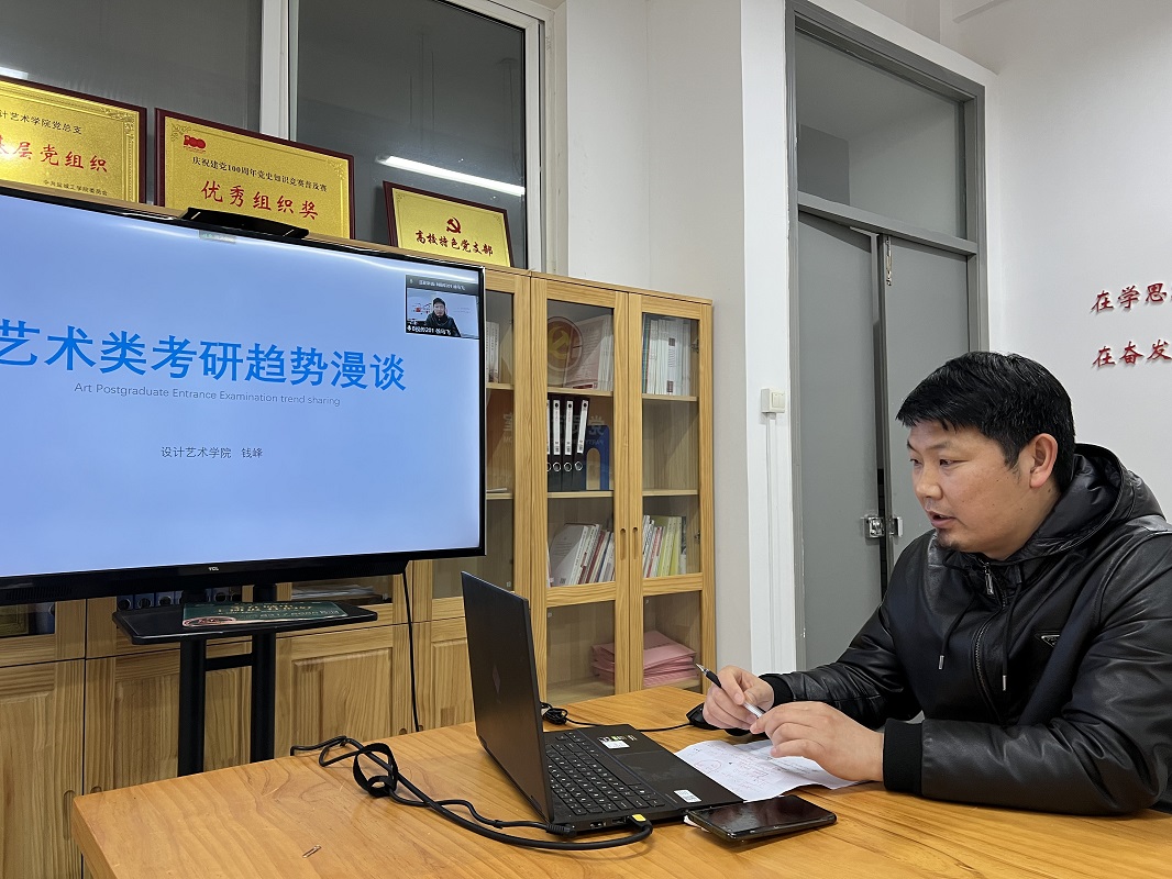 3月30日下午,在希望大道校区润美楼A306会议室,设计艺术学院举办线上考研动员指导暨经验交流会。党总支书记胡凌霞、副院长王文广、产品设计系主任钱峰,学工办、团委负责人出席,2021年考取研究生代表唐伟强和全体2019级学生线上参加。会议由党总支副书记杨士卿主持。