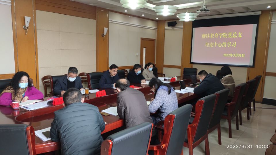 3月31日上午,继续教育学院党总支在建军东路校区图书馆301会议室召开春学期第1次理论学习中心组学习会,学院党总支书记、院长陈志华领学并作重点发言,校党委第四巡学旁听组组长洪林、成员宋倩倩到会指导。
