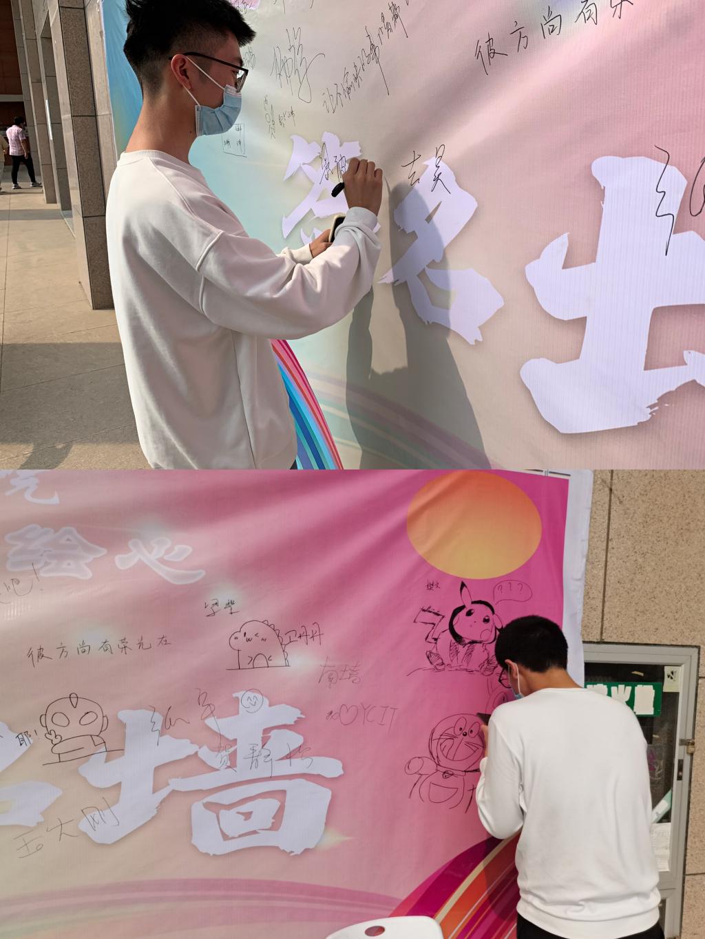 活动一经发出,便得到了同学们的积极响应。全院两百多名学生拿起画笔参与到本次涂鸦当中。活动期间,同学们不仅展示了高超的绘画设计水平,还在作品中展现了积极昂扬的大学生心理素养。涂鸦作品中不仅有对个人美好生活的期待,还有对同班好友真切的鼓励,对学校社会由衷的祝福,营造了“同心共济、向阳生长”的良好氛围。