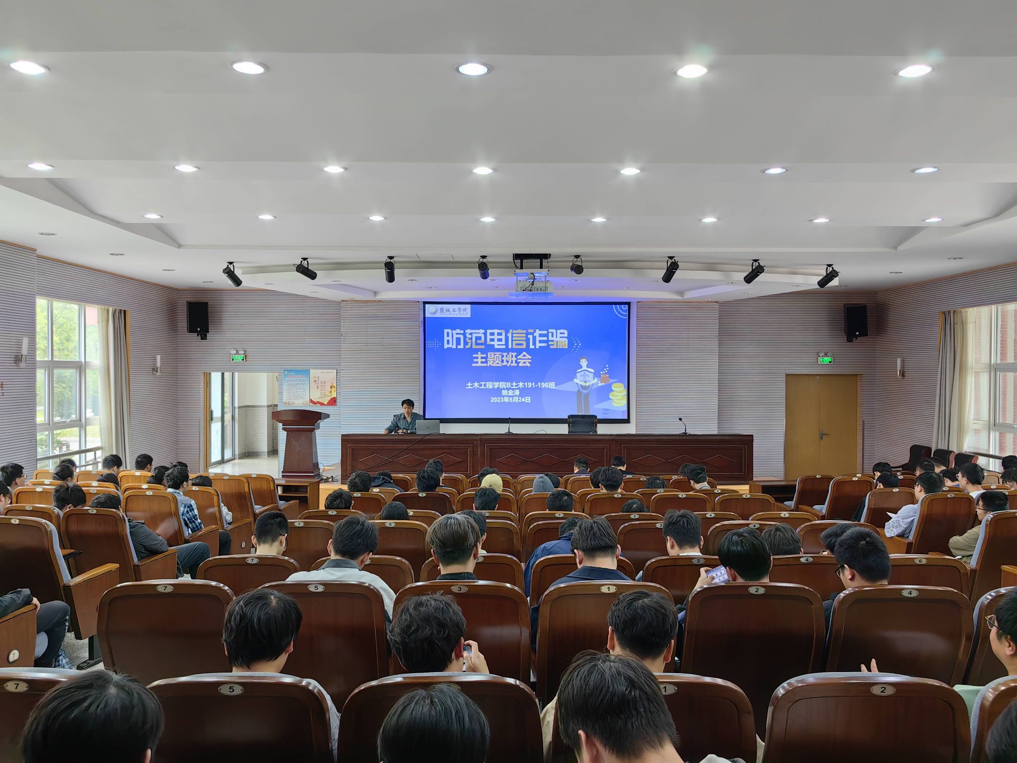 为提高学生防范电信诈骗意识,切实提高广大学生对电信诈骗犯罪的识别和应对能力,自觉抵制非法校园贷,净化校园环境,维护师生的合法权益。5月23-25日,土木工程学院全体专兼职辅导员以责任班级为单位,分别在希望大道校区和建军东路校区召开防范电信诈骗主题班会。