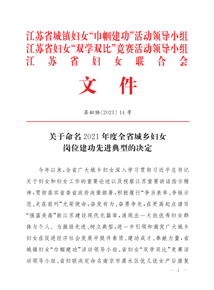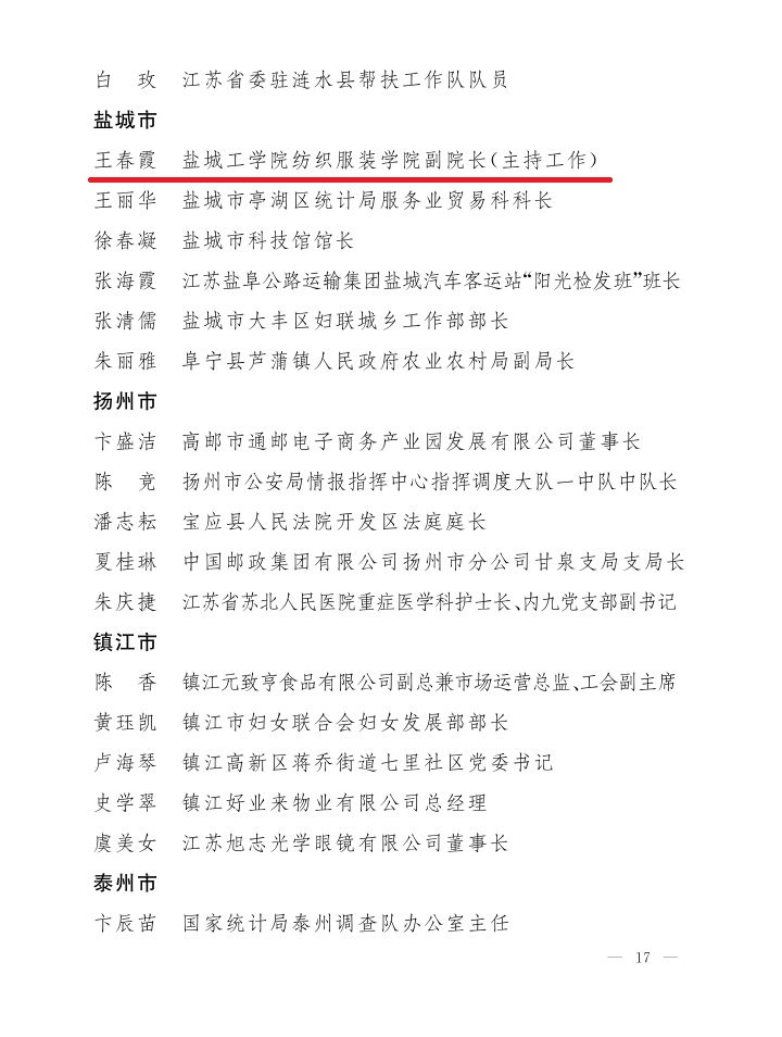近日,江苏省城镇妇女“巾帼建功””活动领导小组、省妇女“双学双比”竞赛活动领导小组、省妇联联合下发《澳客彩票网_中国足球彩票-app官方下载命名2021年度全省城乡妇女岗位建功先进典型的决定》(苏妇协[2021]14号),澳客彩票网_中国足球彩票-app官方下载纺织服装学院院长王春霞教授在2021年全省城乡妇女岗位建功活动中,荣获“江苏省巾帼建功标兵”称号。据悉,王春霞教授是此次入选的盐城市6位女性中的唯一一位高校女性。